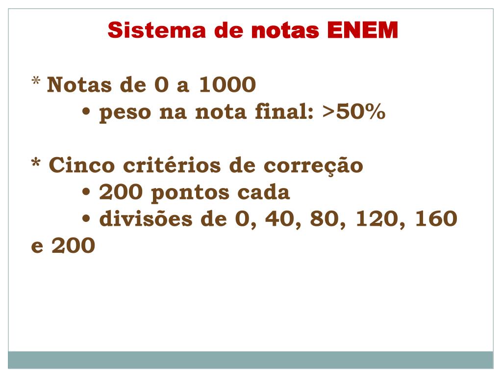 Sistema de notas ENEM *Notas de 0 a 1000 • peso na nota final: >50% * Cinco critérios de correção • 200 pontos cada • divisões de 0, 40, 80, 120, 160 e 200