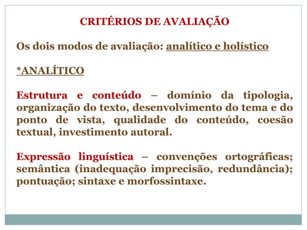 CRITÉRIOS DE AVALIAÇÃO Os dois modos de avaliação: analítico e holístico *ANALÍTICO Estrutura e conteúdo – domínio da tipologia, organização do texto, desenvolvimento do tema e do ponto de vista, qualidade do conteúdo, coesão textual, investimento autoral. Expressão linguística – convenções ortográficas; semântica (inadequação imprecisão, redundância); pontuação; sintaxe e morfossintaxe.
