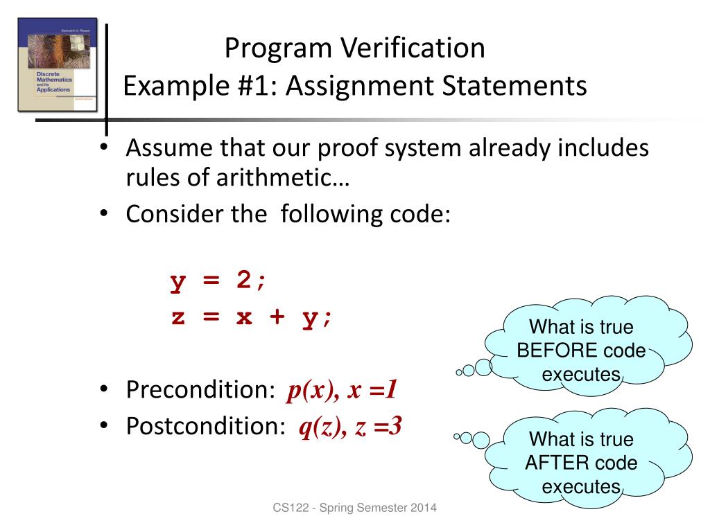 Program VerificationExample #1: Assignment Statements • Prove that the program segment: y = 2; z = x + y; • Is correct with respect to precondition: x = 1 postcondition: z = 3 • Suppose x = 1 is true as program begins • Then y is assigned the value of 2 • Then z is assigned the value of 3 (x + y = 1 + 2) • Thus, the program segment is correct with regards to the precondition that x = 1 & postcondition z = 3 CS122 - Spring Semester 2014