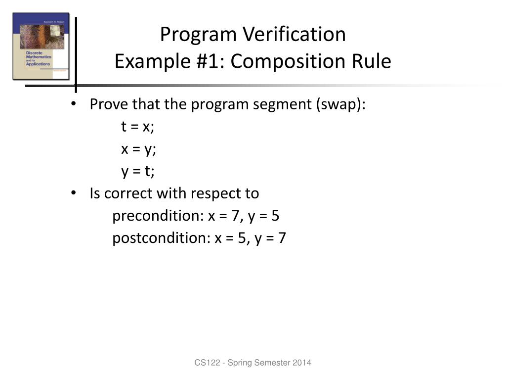 Program VerificationExample #1: Composition Rule • Prove that the program segment (swap): t= x; x = y; y = t; • Is correct with respect to precondition: x = 7, y = 5 postcondition: x = 5, y = 7 CS122 - Spring Semester 2014