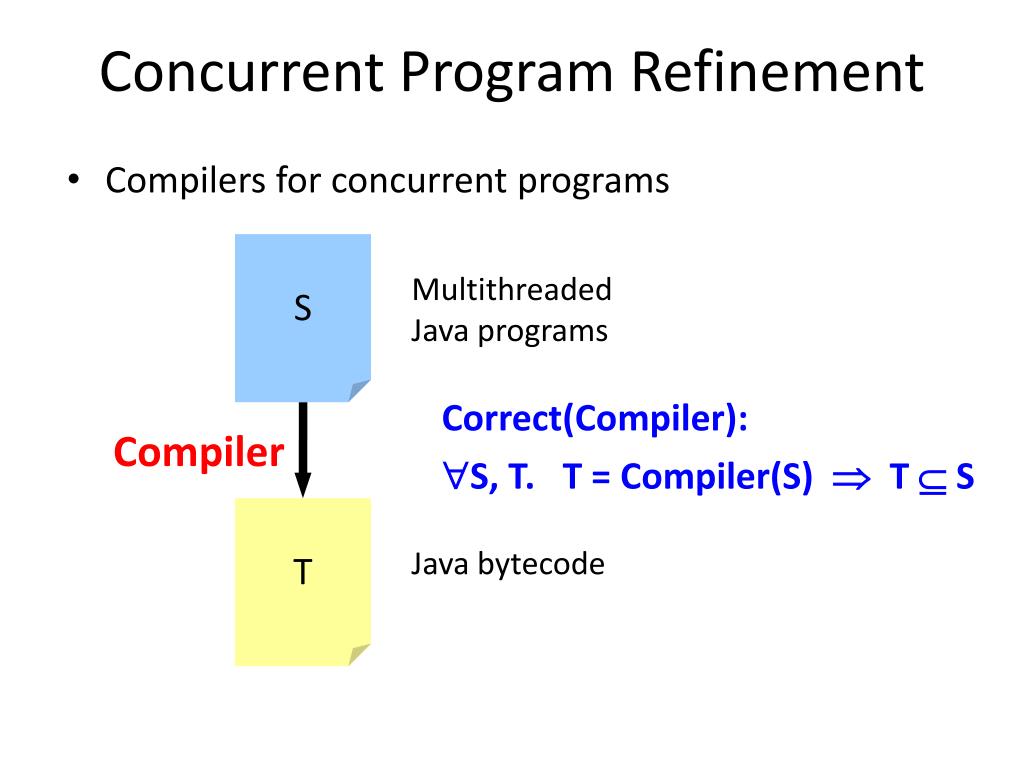 Concurrent Program Refinement • Compilers for concurrent programs S Multithreaded Java programs Correct(Compiler): S, T. T = Compiler(S) T S Compiler T Java bytecode