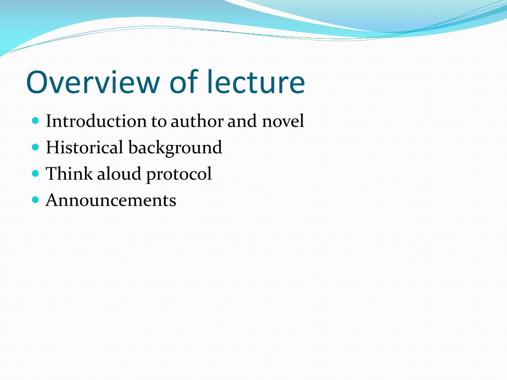 Overview of lecture • Introduction to author and novel • Historical background • Think aloud protocol • Announcements