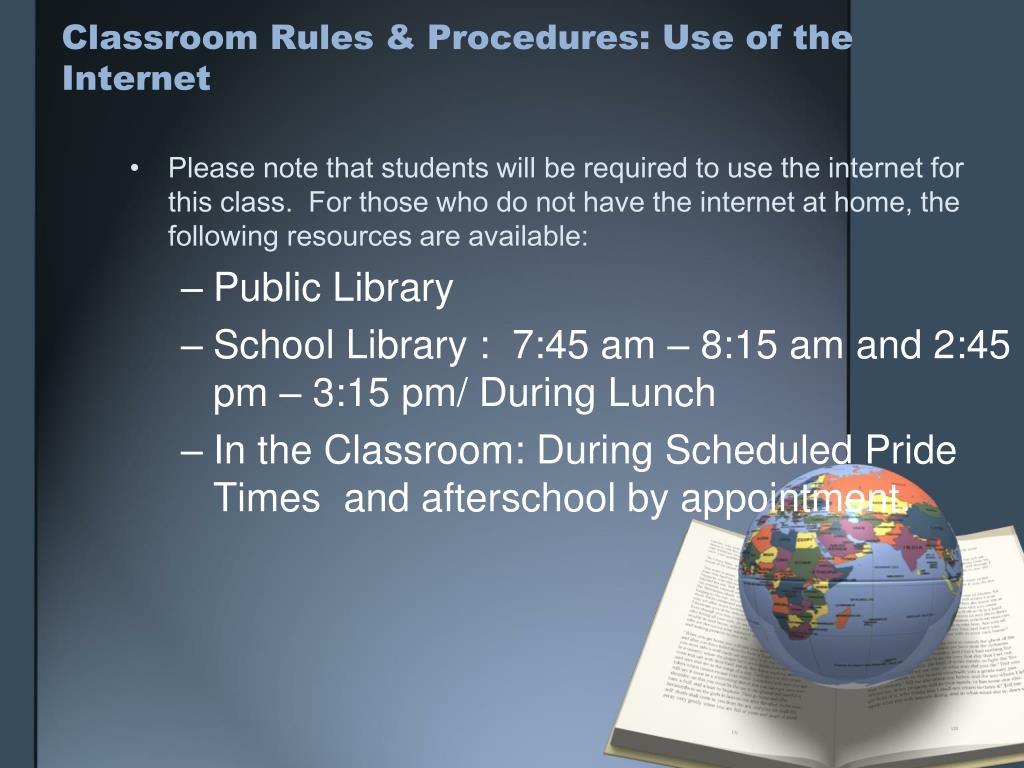 Classroom Rules & Procedures: Use of the Internet • Please note that students will be required to use the internet for this class. For those who do not have the internet at home, the following resources are available: • Public Library • School Library : 7:45 am – 8:15 am and 2:45 pm – 3:15 pm/ During Lunch • In the Classroom: During Scheduled Pride Times and afterschool by appointment.
