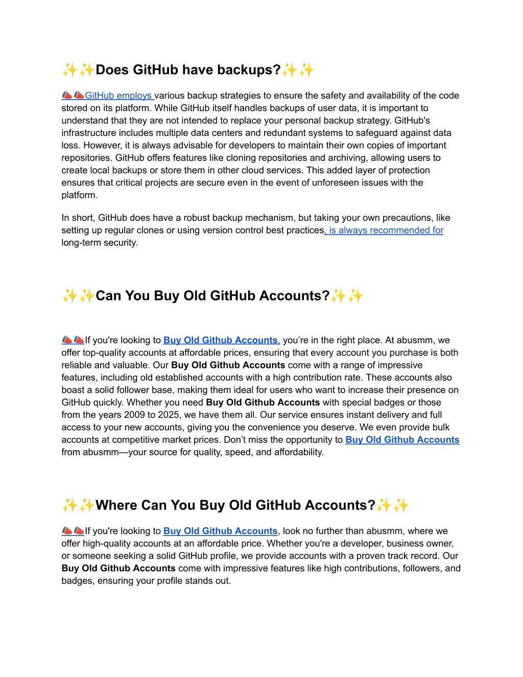 ✨✨Does GitHub have backups?✨✨ ??GitHub employs various backup strategies to ensure the safety and availability of the code stored on its platform. While GitHub itself handles backups of user data, it is important to understand that they are not intended to replace your personal backup strategy. GitHub's infrastructure includes multiple data centers and redundant systems to safeguard against data loss. However, it is always advisable for developers to maintain their own copies of important repositories. GitHub offers features like cloning repositories and archiving, allowing users to create local backups or store them in other cloud services. This added layer of protection ensures that critical projects are secure even in the event of unforeseen issues with the platform. In short, GitHub does have a robust backup mechanism, but taking your own precautions, like setting up regular clones or using version control best practices, is always recommended for long-term security. ✨✨Can You Buy Old GitHub Accounts?✨✨ ??If you're looking to Buy Old Github Accounts, you’re in the right place. At abusmm, we offer top-quality accounts at affordable prices, ensuring that every account you purchase is both reliable and valuable. Our Buy Old Github Accounts come with a range of impressive features, including old established accounts with a high contribution rate. These accounts also boast a solid follower base, making them ideal for users who want to increase their presence on GitHub quickly. Whether you need Buy Old Github Accounts with special badges or those from the years 2009 to 2025, we have them all. Our service ensures instant delivery and full access to your new accounts, giving you the convenience you deserve. We even provide bulk accounts at competitive market prices. Don’t miss the opportunity to Buy Old Github Accounts from abusmm—your source for quality, speed, and affordability. ✨✨Where Can You Buy Old GitHub Accounts?✨✨ ??If you're looking to Buy Old Github Accounts, look no further than abusmm, where we offer high-quality accounts at an affordable price. Whether you're a developer, business owner, or someone seeking a solid GitHub profile, we provide accounts with a proven track record. Our Buy Old Github Accounts come with impressive features like high contributions, followers, and badges, ensuring your profile stands out.