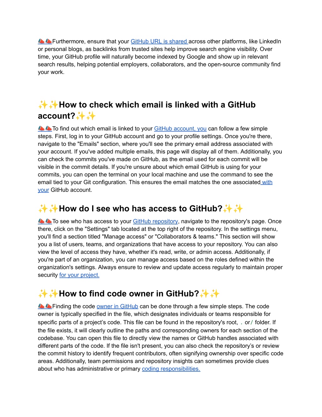 ??Furthermore, ensure that your GitHub URL is shared across other platforms, like LinkedIn or personal blogs, as backlinks from trusted sites help improve search engine visibility. Over time, your GitHub profile will naturally become indexed by Google and show up in relevant search results, helping potential employers, collaborators, and the open-source community find your work. ✨✨How to check which email is linked with a GitHub account?✨✨ ??To find out which email is linked to your GitHub account, you can follow a few simple steps. First, log in to your GitHub account and go to your profile settings. Once you're there, navigate to the "Emails" section, where you'll see the primary email address associated with your account. If you've added multiple emails, this page will display all of them. Additionally, you can check the commits you've made on GitHub, as the email used for each commit will be visible in the commit details. If you're unsure about which email GitHub is using for your commits, you can open the terminal on your local machine and use the command to see the email tied to your Git configuration. This ensures the email matches the one associated with your GitHub account. ✨✨How do I see who has access to GitHub?✨✨ ??To see who has access to your GitHub repository, navigate to the repository's page. Once there, click on the "Settings" tab located at the top right of the repository. In the settings menu, you'll find a section titled "Manage access" or "Collaborators & teams." This section will show you a list of users, teams, and organizations that have access to your repository. You can also view the level of access they have, whether it's read, write, or admin access. Additionally, if you're part of an organization, you can manage access based on the roles defined within the organization's settings. Always ensure to review and update access regularly to maintain proper security for your project. ✨✨How to find code owner in GitHub?✨✨ ??Finding the code owner in GitHub can be done through a few simple steps. The code owner is typically specified in the file, which designates individuals or teams responsible for specific parts of a project’s code. This file can be found in the repository's root, . or/ folder. If the file exists, it will clearly outline the paths and corresponding owners for each section of the codebase. You can open this file to directly view the names or GitHub handles associated with different parts of the code. If the file isn't present, you can also check the repository’s or review the commit history to identify frequent contributors, often signifying ownership over specific code areas. Additionally, team permissions and repository insights can sometimes provide clues about who has administrative or primary coding responsibilities.
