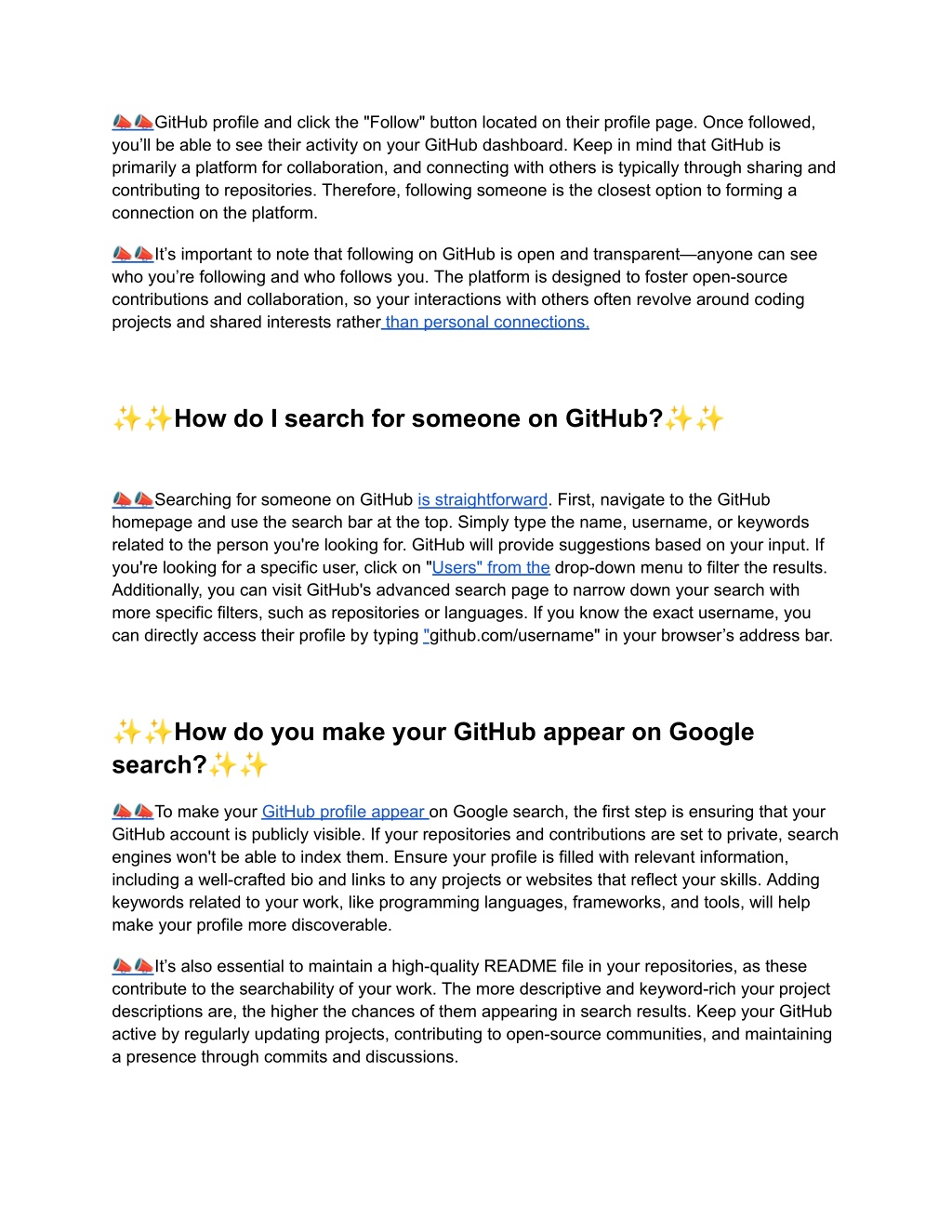 ??GitHub profile and click the "Follow" button located on their profile page. Once followed, you’ll be able to see their activity on your GitHub dashboard. Keep in mind that GitHub is primarily a platform for collaboration, and connecting with others is typically through sharing and contributing to repositories. Therefore, following someone is the closest option to forming a connection on the platform. ??It’s important to note that following on GitHub is open and transparent—anyone can see who you’re following and who follows you. The platform is designed to foster open-source contributions and collaboration, so your interactions with others often revolve around coding projects and shared interests rather than personal connections. ✨✨How do I search for someone on GitHub?✨✨ ??Searching for someone on GitHub is straightforward. First, navigate to the GitHub homepage and use the search bar at the top. Simply type the name, username, or keywords related to the person you're looking for. GitHub will provide suggestions based on your input. If you're looking for a specific user, click on "Users" from the drop-down menu to filter the results. Additionally, you can visit GitHub's advanced search page to narrow down your search with more specific filters, such as repositories or languages. If you know the exact username, you can directly access their profile by typing "github.com/username" in your browser’s address bar. ✨✨How do you make your GitHub appear on Google search?✨✨ ??To make your GitHub profile appear on Google search, the first step is ensuring that your GitHub account is publicly visible. If your repositories and contributions are set to private, search engines won't be able to index them. Ensure your profile is filled with relevant information, including a well-crafted bio and links to any projects or websites that reflect your skills. Adding keywords related to your work, like programming languages, frameworks, and tools, will help make your profile more discoverable. ??It’s also essential to maintain a high-quality README file in your repositories, as these contribute to the searchability of your work. The more descriptive and keyword-rich your project descriptions are, the higher the chances of them appearing in search results. Keep your GitHub active by regularly updating projects, contributing to open-source communities, and maintaining a presence through commits and discussions.