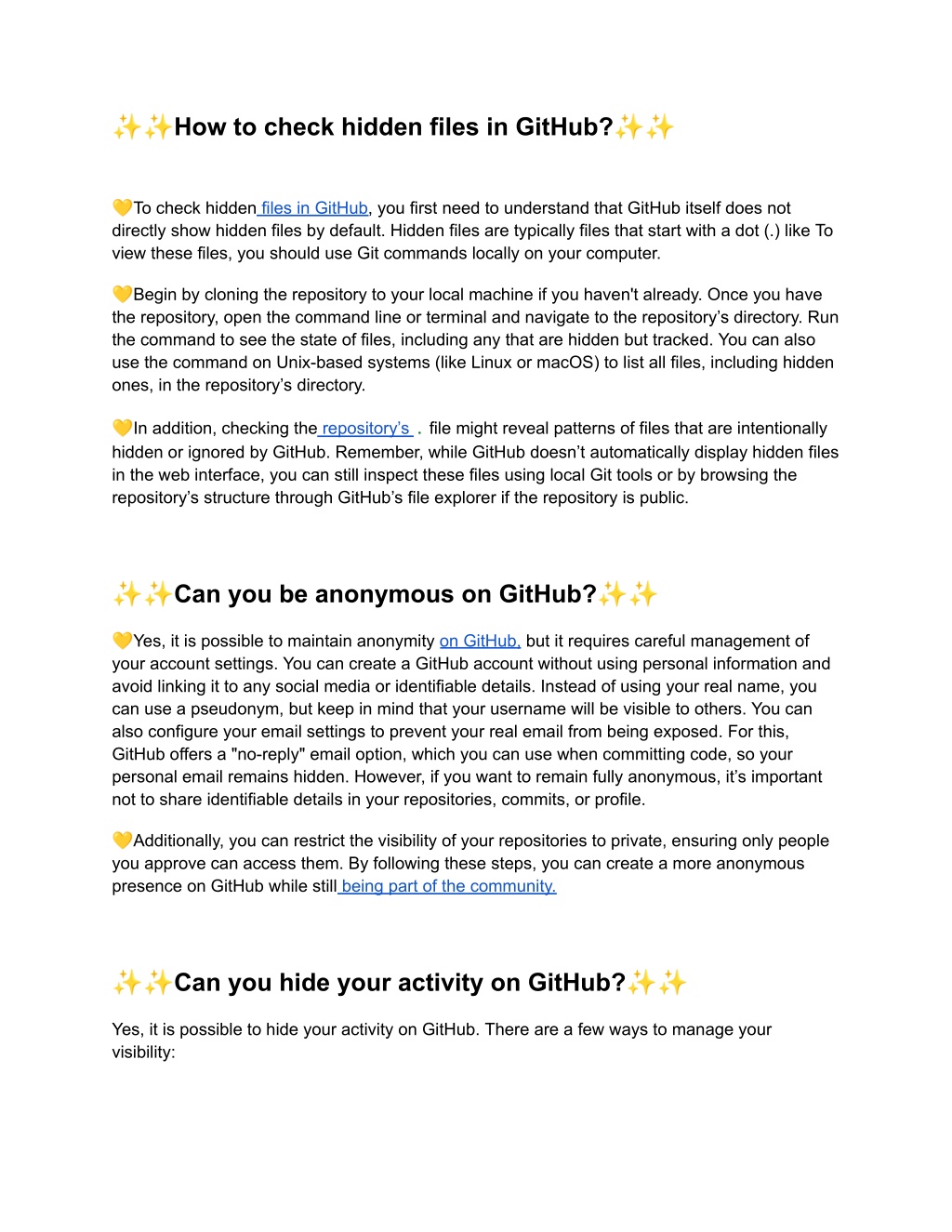 ✨✨How to check hidden files in GitHub?✨✨ ?To check hidden files in GitHub, you first need to understand that GitHub itself does not directly show hidden files by default. Hidden files are typically files that start with a dot (.) like To view these files, you should use Git commands locally on your computer. ?Begin by cloning the repository to your local machine if you haven't already. Once you have the repository, open the command line or terminal and navigate to the repository’s directory. Run the command to see the state of files, including any that are hidden but tracked. You can also use the command on Unix-based systems (like Linux or macOS) to list all files, including hidden ones, in the repository’s directory. ?In addition, checking the repository’s . file might reveal patterns of files that are intentionally hidden or ignored by GitHub. Remember, while GitHub doesn’t automatically display hidden files in the web interface, you can still inspect these files using local Git tools or by browsing the repository’s structure through GitHub’s file explorer if the repository is public. ✨✨Can you be anonymous on GitHub?✨✨ ?Yes, it is possible to maintain anonymity on GitHub, but it requires careful management of your account settings. You can create a GitHub account without using personal information and avoid linking it to any social media or identifiable details. Instead of using your real name, you can use a pseudonym, but keep in mind that your username will be visible to others. You can also configure your email settings to prevent your real email from being exposed. For this, GitHub offers a "no-reply" email option, which you can use when committing code, so your personal email remains hidden. However, if you want to remain fully anonymous, it’s important not to share identifiable details in your repositories, commits, or profile. ?Additionally, you can restrict the visibility of your repositories to private, ensuring only people you approve can access them. By following these steps, you can create a more anonymous presence on GitHub while still being part of the community. ✨✨Can you hide your activity on GitHub?✨✨ Yes, it is possible to hide your activity on GitHub. There are a few ways to manage your visibility: