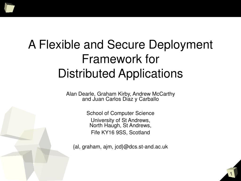 A Flexible and Secure Deployment Framework for Distributed Applications. Alan Dearle, Graham Kirby, Andrew McCarthy and Juan Carlos Diaz y Carballo School of Computer Science University of St Andrews, North Haugh, St Andrews, Fife KY16 9SS, Scotland {al, graham, ajm, jcd}@dcs.st-and.ac.uk.