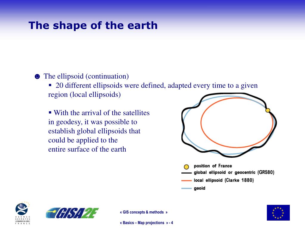 The shape of the earth • The geoid • Ellipsoid does not take into account the heterogeneity inherent on the earth’s surface (assessment problem of the altitude) • Altitude measurements must be based on the mean sea level • identified along the shorelines (extended under the continents) • based on an equal force of gravity = the representation is called geoid