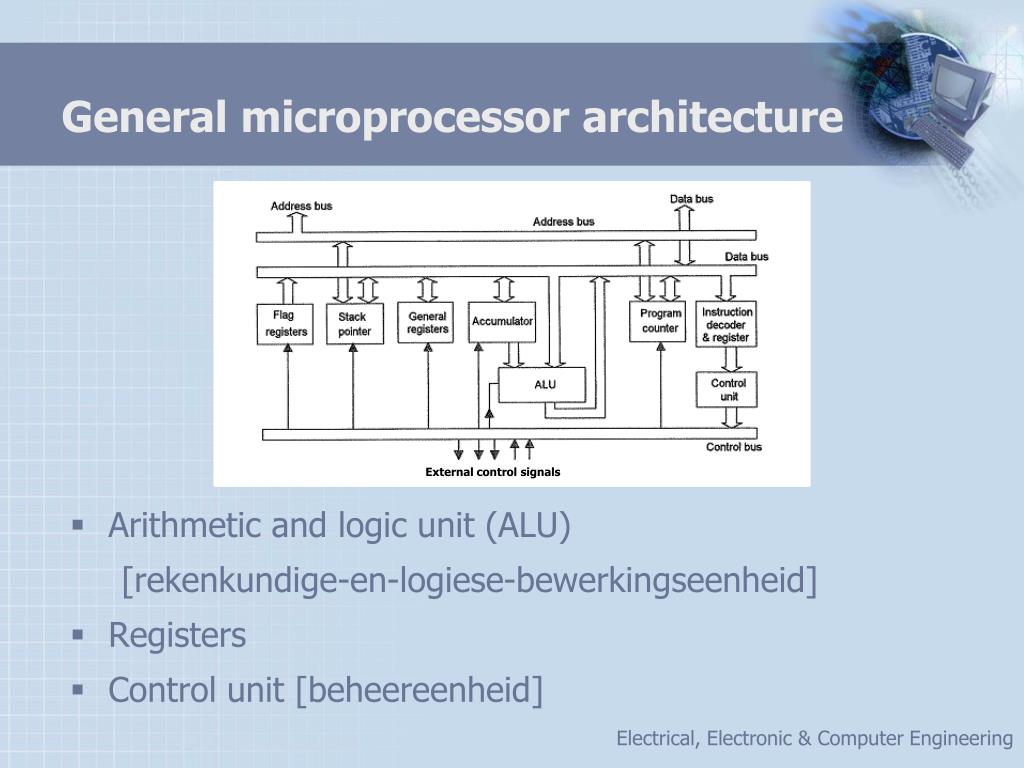 General microprocessor architecture • Arithmetic and logic unit (ALU) [rekenkundige-en-logiese-bewerkingseenheid] • Registers • Control unit [beheereenheid] External control signals