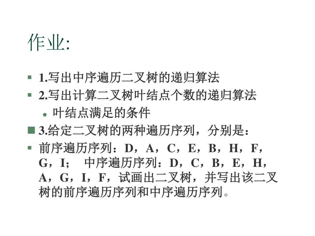 作业: • 1.写出中序遍历二叉树的递归算法 • 2.写出计算二叉树叶结点个数的递归算法 • 叶结点满足的条件 • 3.给定二叉树的两种遍历序列,分别是: • 前序遍历序列:D,A,C,E,B,H,F,G,I; 中序遍历序列:D,C,B,E,H,A,G,I,F,试画出二叉树,并写出该二叉树的前序遍历序列和中序遍历序列。