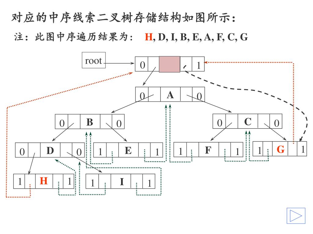 对应的中序线索二叉树存储结构如图所示: A 0 0 C B 0 0 0 0 1 G F E 1 D 1 1 1 0 1 0 H 1 1 I 1 1 注:此图中序遍历结果为: H, D, I, B, E, A, F, C, G root 0 1