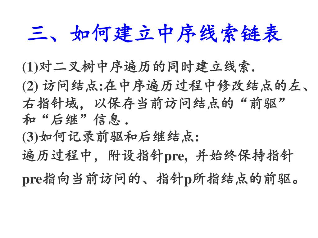 三、如何建立中序线索链表 (1)对二叉树中序遍历的同时建立线索. (2) 访问结点:在中序遍历过程中修改结点的左、右指针域,以保存当前访问结点的“前驱”和“后继”信息 . (3)如何记录前驱和后继结点: 遍历过程中,附设指针pre, 并始终保持指针pre指向当前访问的、指针p所指结点的前驱。