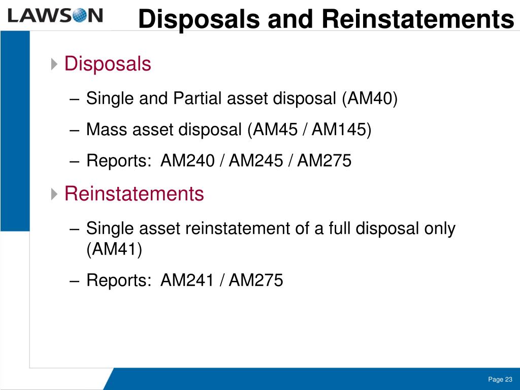 Disposals and Reinstatements • Disposals • Single and Partial asset disposal (AM40) • Mass asset disposal (AM45 / AM145) • Reports: AM240 / AM245 / AM275 • Reinstatements • Single asset reinstatement of a full disposal only (AM41) • Reports: AM241 / AM275