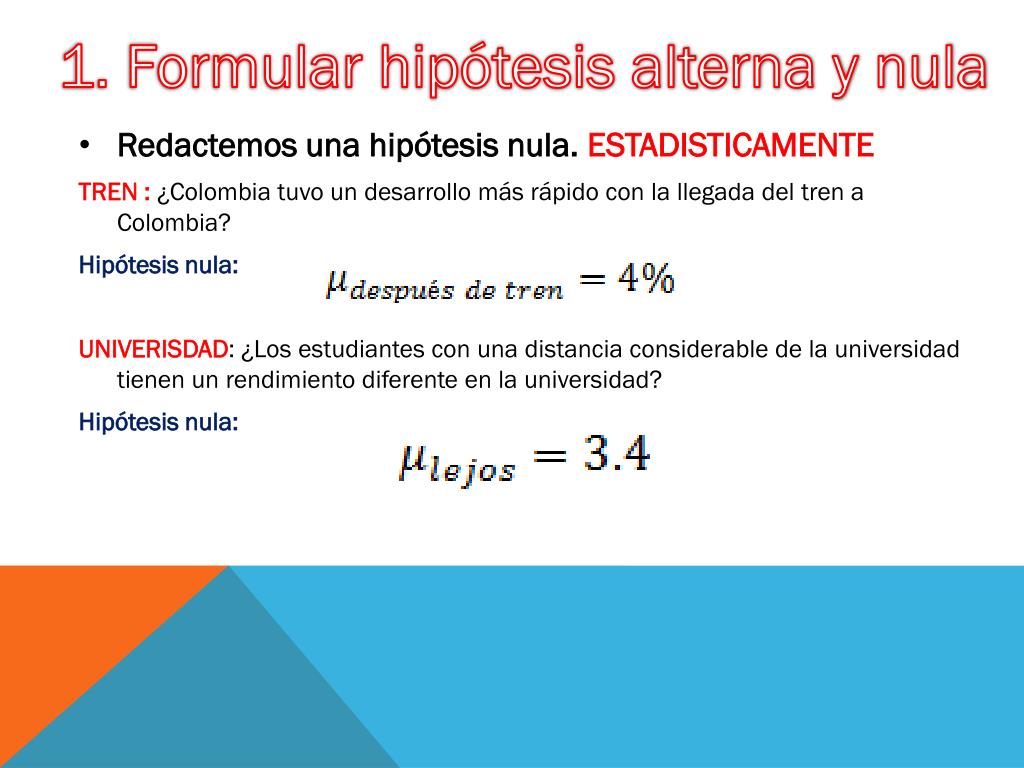 1. Formular hipótesis alterna y nula • Redactemos una hipótesis nula. • TREN : ¿Colombia tuvo un desarrollo más rápido con la llegada del tren a Colombia? • Hipótesis nula: No hubo ningún cambio en el crecimiento económico antes y después de la llegada del tren. • UNIVERISDAD: ¿Los estudiantes con una distancia considerable de la universidad tienen un rendimiento diferente en la universidad? • Hipótesis nula: El rendimiento académico de las personas con una distancia del hogar relativamente lejos tienen el mismo rendimiento que el promedio general de estudiantes.