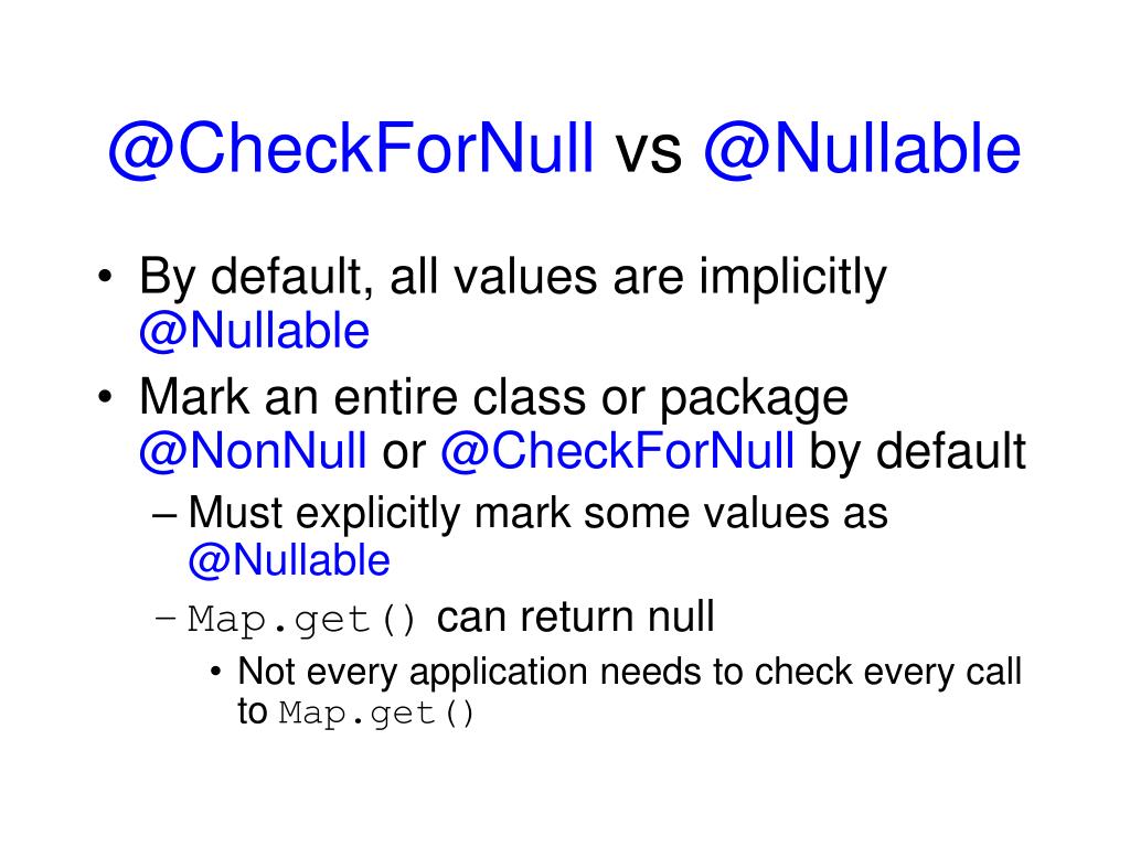 @CheckForNull vs @Nullable • By default, all values are implicitly @Nullable • Mark an entire class or package @NonNull or @CheckForNull by default • Must explicitly mark some values as @Nullable • Map.get() can return null • Not every application needs to check every call to Map.get()