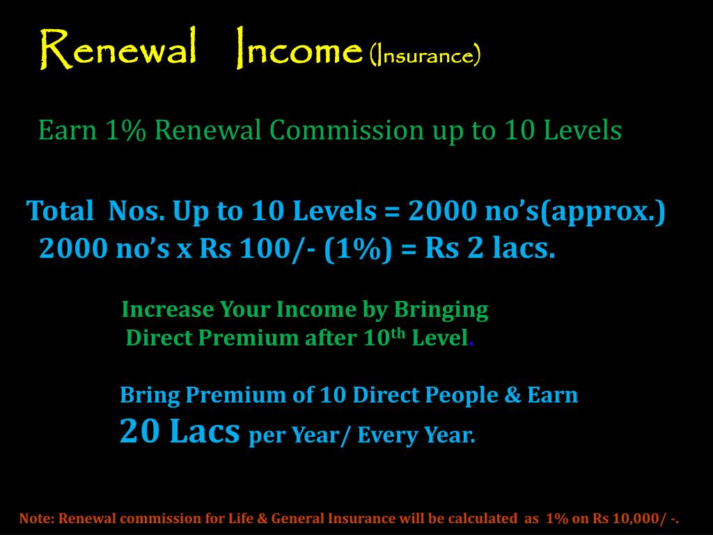 Renewal Income (Insurance) Earn 1% Renewal Commission up to 10 Levels (Calculated on Renewal Premium of Rs 10,000/year) Total Nos. Up to 10 Levels = 2000 no’s(approx.) 2000 no’s x Rs 100/- (1%) = Rs 2 lacs. Increase Your Income by Bringing Direct Premium after 10th Level. Bring Premium of 10 Direct People & Earn 20 Lacsper Year/ Every Year. Note: Renewal commission for Life & General Insurance will be calculated as 1% on Rs 10,000/ -.