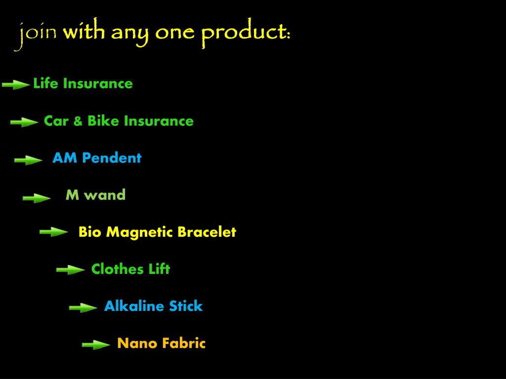 join with any one product: Life Insurance Car & Bike Insurance • AM Pendent • M wand • Bio Magnetic Bracelet • Clothes Lift Alkaline Stick • Nano Fabric
