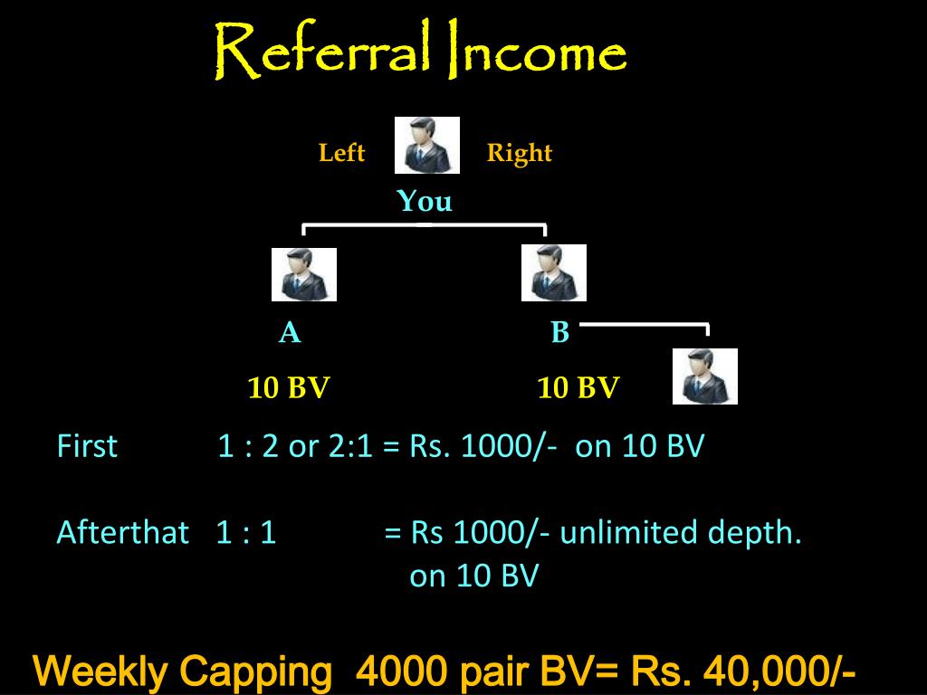 Referral Income Left Right You A 10 BV B 10 BV First 1 : 2 or 2:1 = Rs. 1000/- on 10 BV Afterthat 1 : 1 = Rs 1000/- unlimited depth. on 10 BV Weekly Capping 4000 pair BV= Rs. 40,000/-