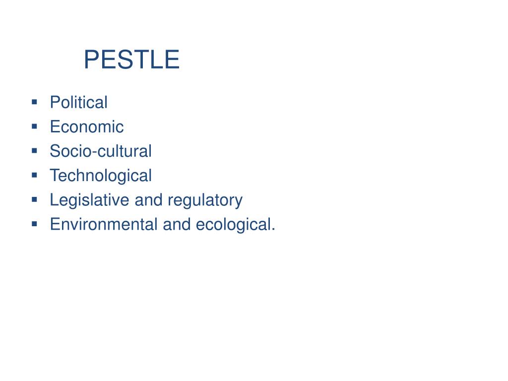 PESTLE • Political • Economic • Socio-cultural • Technological • Legislative and regulatory • Environmental and ecological.