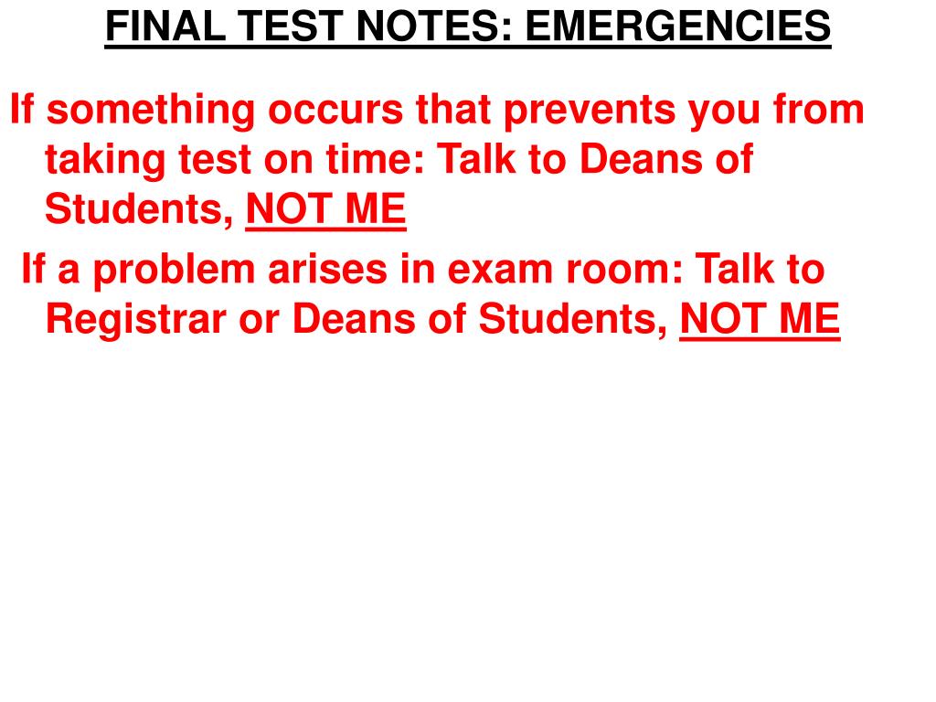FINAL TEST NOTES: EMERGENCIES If something occurs that prevents you from taking test on time: Talk to Deans of Students, NOT ME If a problem arises in exam room: Talk to Registrar or Deans of Students, NOT ME