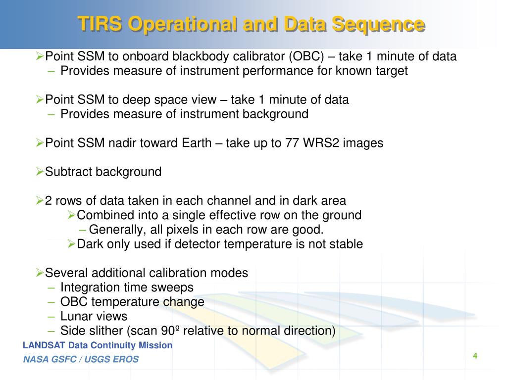 TIRS Operational and Data Sequence Point SSM to onboard blackbody calibrator (OBC) – take 1 minute of data Provides measure of instrument performance for known target Point SSM to deep space view – take 1 minute of data Provides measure of instrument background Point SSM nadir toward Earth – take up to 77 WRS2 images Subtract background 2 rows of data taken in each channel and in dark area Combined into a single effective row on the ground Generally, all pixels in each row are good. Dark only used if detector temperature is not stable Several additional calibration modes Integration time sweeps OBC temperature change Lunar views Side slither (scan 90º relative to normal direction)