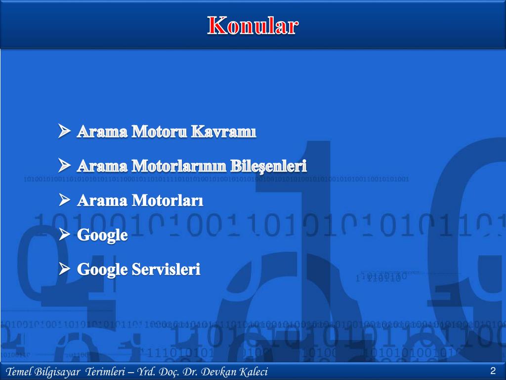 Konular • Arama Motoru Kavramı • Arama Motorlarının Bileşenleri • Arama Motorları • Google • Google Servisleri Temel Bilgisayar Terimleri – Yrd. Doç. Dr. Devkan Kaleci