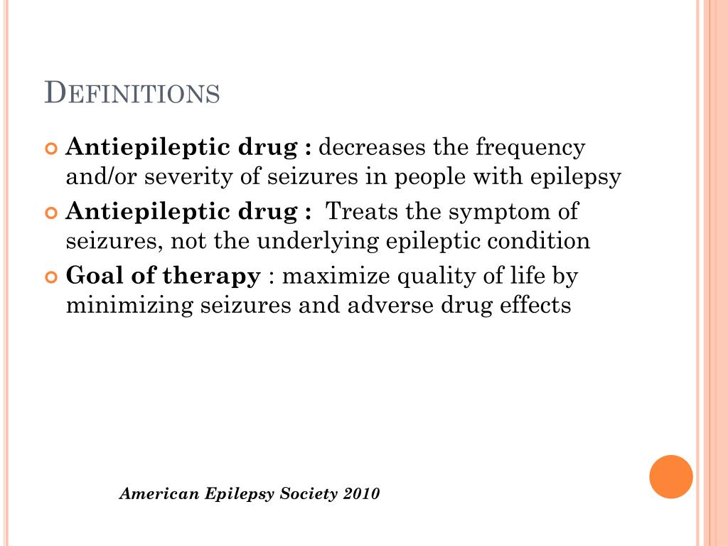 Definitions • Antiepileptic drug : decreases the frequency and/or severity of seizures in people with epilepsy • Antiepileptic drug : Treats the symptom of seizures, not the underlying epileptic condition • Goal of therapy : maximize quality of life by minimizing seizures and adverse drug effects American Epilepsy Society 2010