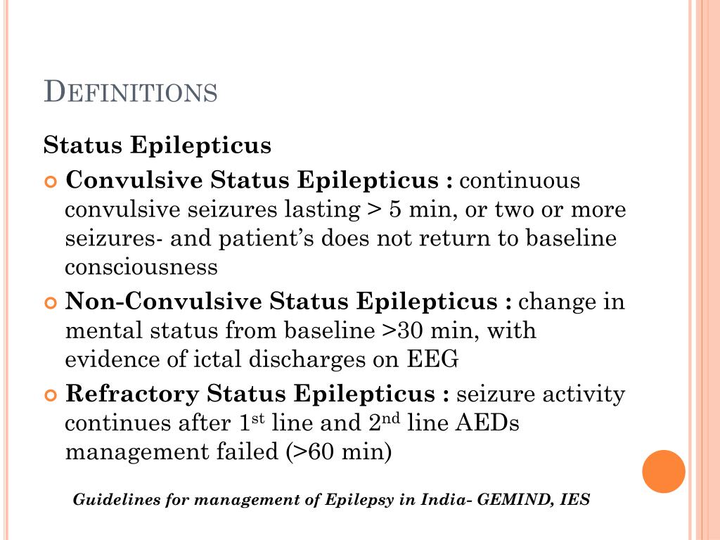 Definitions Status Epilepticus • Convulsive Status Epilepticus : continuous convulsive seizures lasting > 5 min, or two or more seizures- and patient’s does not return to baseline consciousness • Non-Convulsive Status Epilepticus : change in mental status from baseline >30 min, with evidence of ictal discharges on EEG • Refractory Status Epilepticus : seizure activity continues after 1st line and 2nd line AEDs management failed (>60 min) Guidelines for management of Epilepsy in India- GEMIND, IES