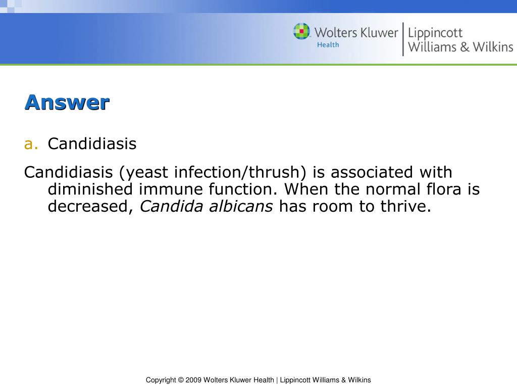 Answer • Candidiasis Candidiasis (yeast infection/thrush) is associated with diminished immune function. When the normal flora is decreased, Candida albicans has room to thrive.