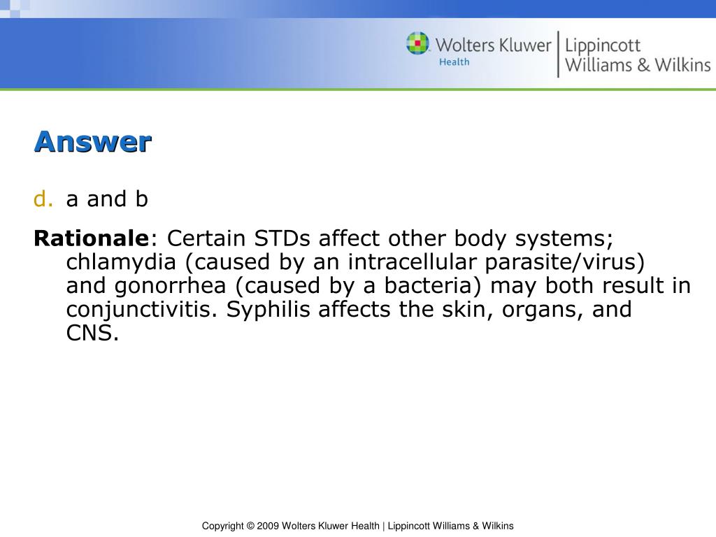 Answer • a and b Rationale:Certain STDs affect other body systems; chlamydia (caused by an intracellular parasite/virus) and gonorrhea (caused by a bacteria) may both result in conjunctivitis. Syphilis affects the skin, organs, and CNS.