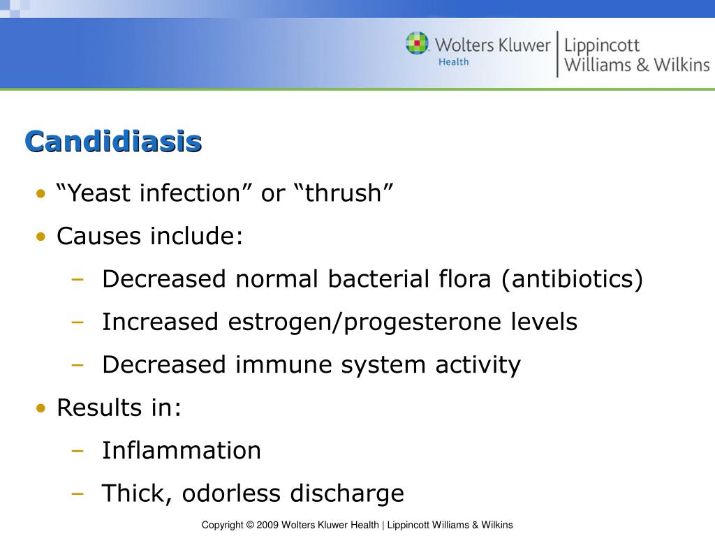 Candidiasis • “Yeast infection” or “thrush” • Causes include: • Decreased normal bacterial flora (antibiotics) • Increased estrogen/progesterone levels • Decreased immune system activity • Results in: • Inflammation • Thick, odorless discharge