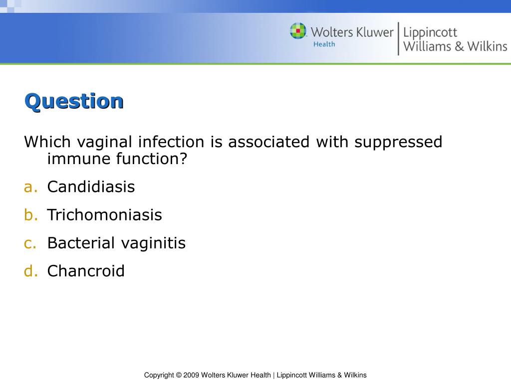 Question Which vaginal infection is associated with suppressed immune function? • Candidiasis • Trichomoniasis • Bacterial vaginitis • Chancroid
