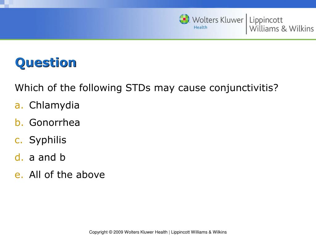 Question Which of the following STDs may cause conjunctivitis? • Chlamydia • Gonorrhea • Syphilis • a and b • All of the above