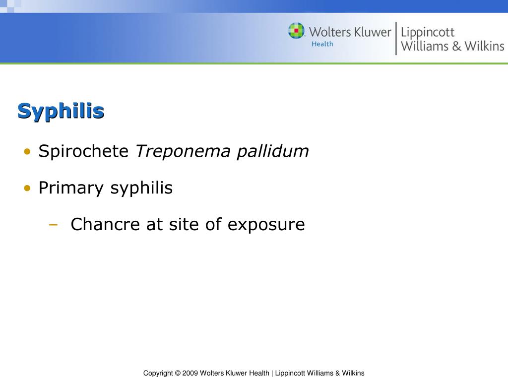 Syphilis • Spirochete Treponema pallidum • Primary syphilis • Chancre at site of exposure
