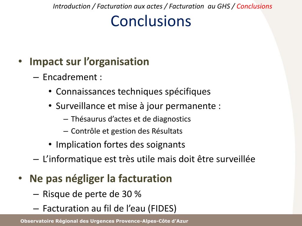 Introduction / Facturation aux actes / Facturation au GHS / Conclusions OptimiserFacturer tous les actes • Identifier tous les ATU (Pédiatrie / Gynécologie ….) • Collecter les éléments de couverture sociale • Objectif 2% ATU non validés (hors afflux touristique) • Disposer d’un thésaurus d’acte à jour • Diffusion thésaurus d’actes ORU / validation CEQ SFMU • Surveiller • Le DEQP 003 / YYYY011 • Les majorations