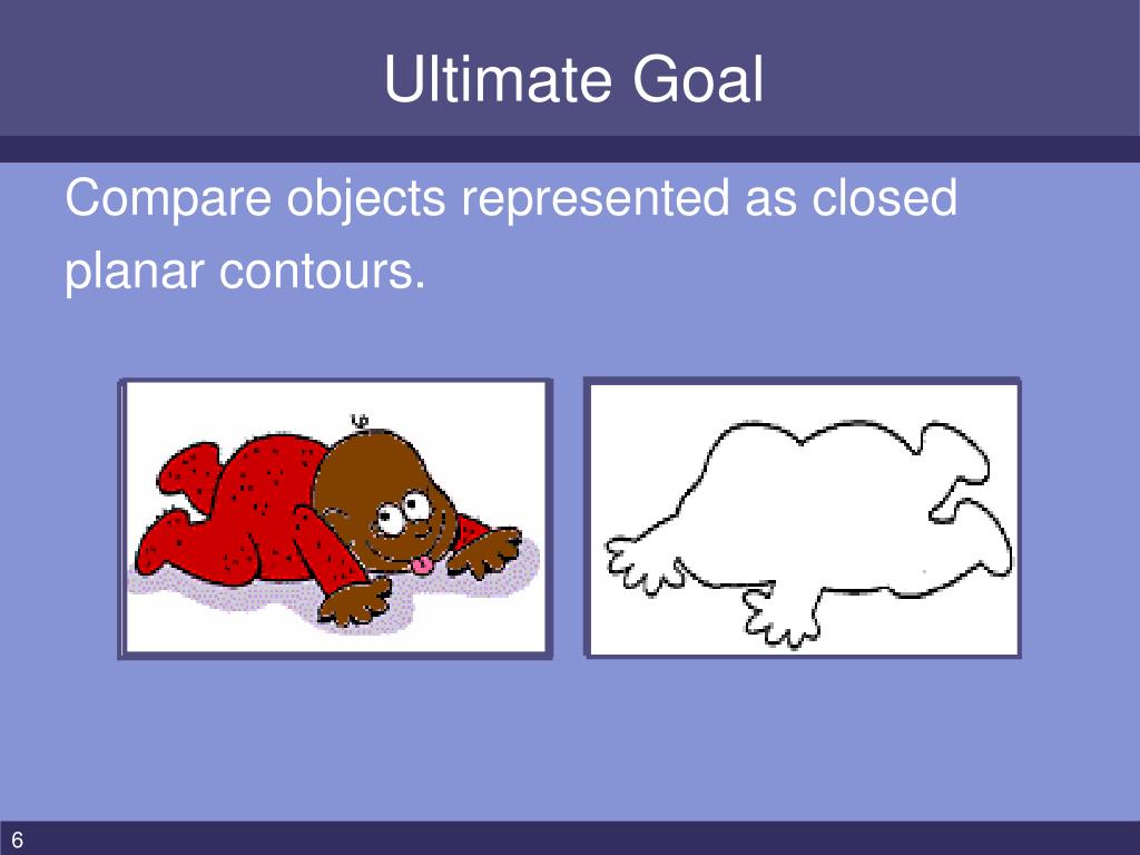 Summary Goal • Define a distance so that shapes that vary by Euclidean transformations have zero distance. • Shapes vary by scaling , articulation , occlusion have small distance. • Resistant to : “small deformations” “high-frequency noise” “localized changes”