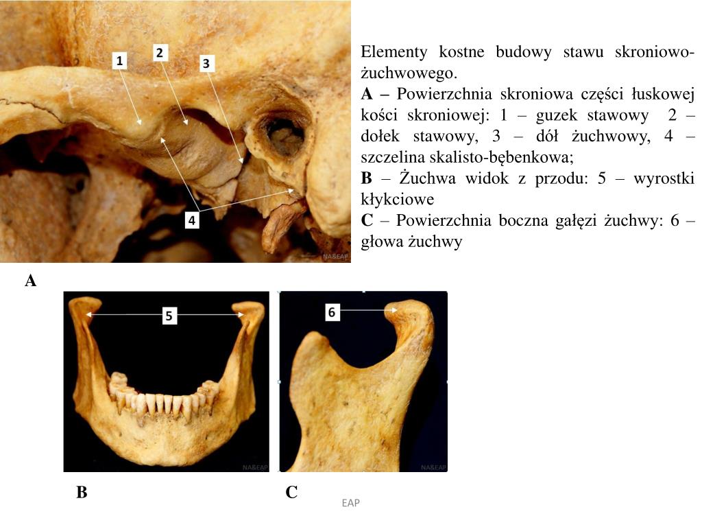 Elementy kostne budowy stawu skroniowo-żuchwowego. • A – Powierzchnia skroniowa części łuskowej kości skroniowej: 1 – guzek stawowy 2 – dołek stawowy, 3 – dół żuchwowy, 4 – szczelina skalisto-bębenkowa; • B – Żuchwa widok z przodu: 5 – wyrostki kłykciowe • C – Powierzchnia boczna gałęzi żuchwy: 6 – głowa żuchwy A • B C EAP