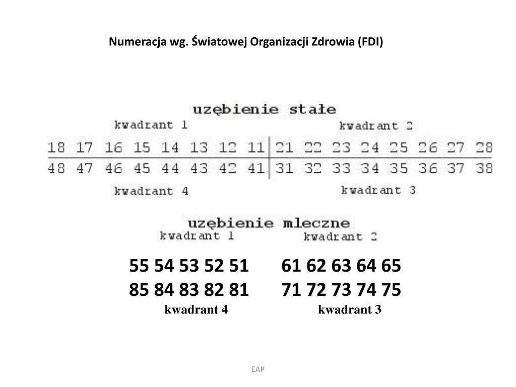 Numeracja wg. Światowej Organizacji Zdrowia (FDI) 55 54 53 52 51 61 62 63 64 65 85 84 83 82 81 71 72 73 74 75 kwadrant 4 kwadrant 3 EAP