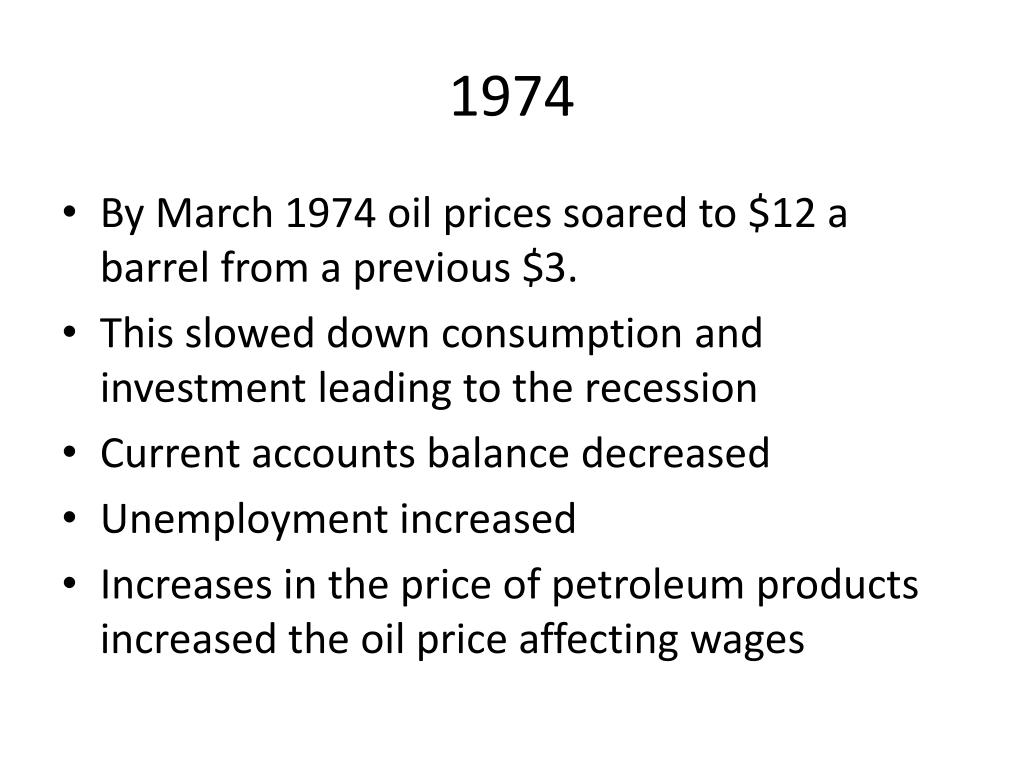 1974 • By March 1974 oil prices soared to $12 a barrel from a previous $3. • This slowed down consumption and investment leading to the recession • Current accounts balance decreased • Unemployment increased • Increases in the price of petroleum products increased the oil price affecting wages