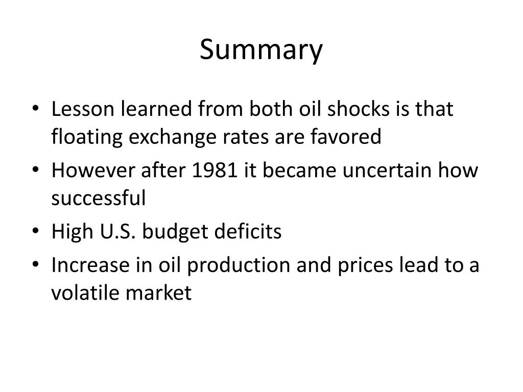 Summary • Lesson learned from both oil shocks is that floating exchange rates are favored • However after 1981 it became uncertain how successful • High U.S. budget deficits • Increase in oil production and prices lead to a volatile market