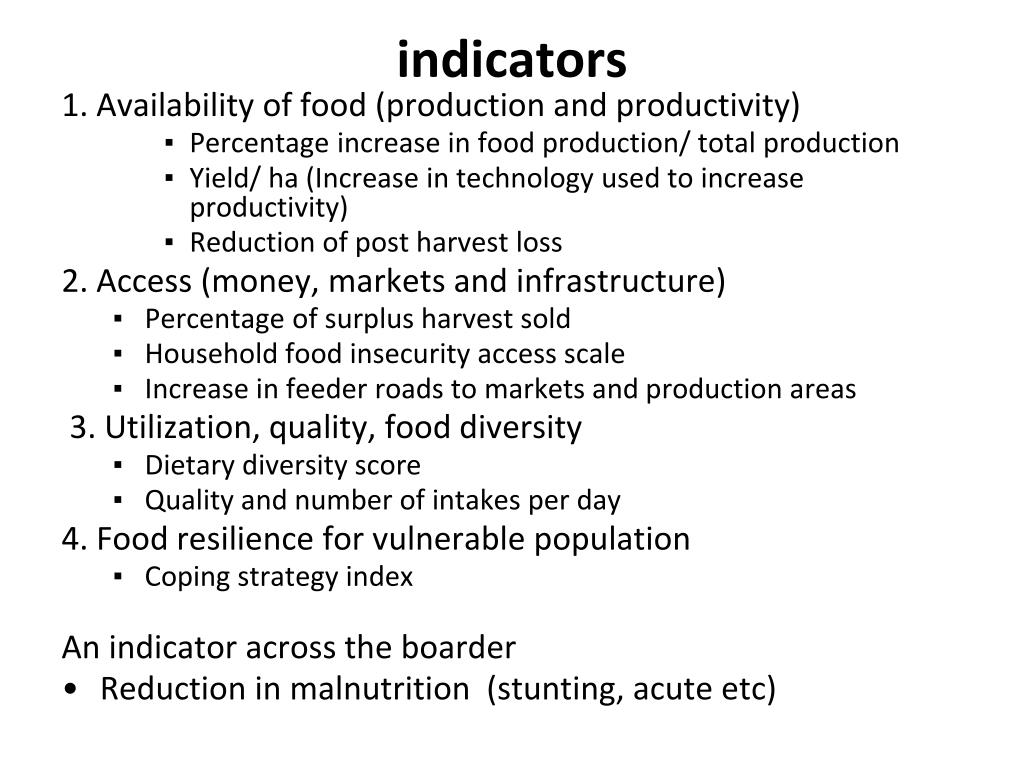 indicators 1. Availability of food (production and productivity) • Percentage increase in food production/ total production • Yield/ ha (Increase in technology used to increase productivity) • Reduction of post harvest loss 2. Access (money, markets and infrastructure) • Percentage of surplus harvest sold • Household food insecurity access scale • Increase in feeder roads to markets and production areas 3. Utilization, quality, food diversity • Dietary diversity score • Quality and number of intakes per day 4. Food resilience for vulnerable population • Coping strategy index An indicator across the boarder • Reduction in malnutrition (stunting, acute etc)