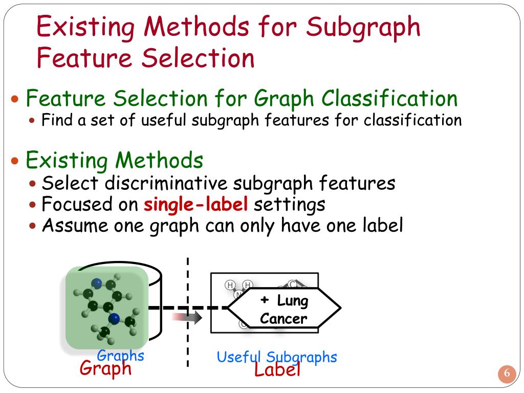 Existing Methods for Subgraph Feature Selection • Feature Selection for Graph Classification • Find a set of useful subgraph features for classification • Existing Methods • Select discriminative subgraph features • Focused on single-label settings • Assume one graph can only have one label C C C C C H H + - O O C C N C Graphs + Lung Cancer Useful Subgraphs • Graph • Label