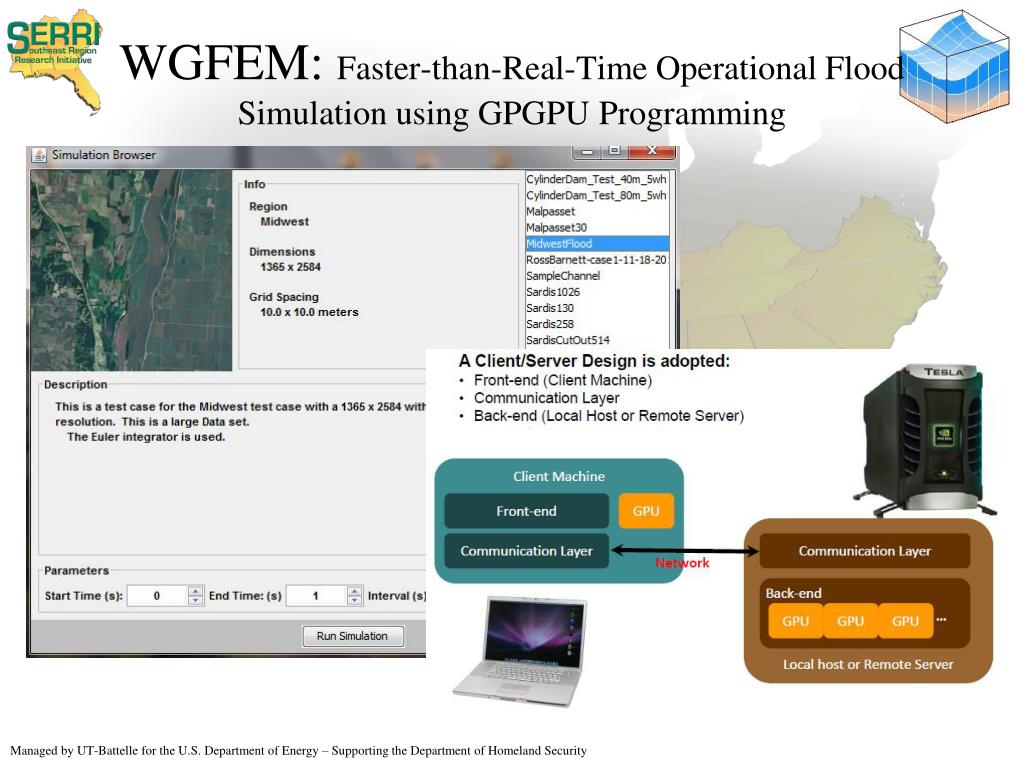 Motivation The DSS-WISE Project was motivated by the scientific and technological gaps identified in the current practice of flood simulation and damage analysis. The current practice relies mostly on one-dimensional flood simulations that cannot provide an accurate, time-dependent spatial evolution of the highly transient catastrophic floods resulting from failure of critical water infrastructures (dam/levee break/breaching), and may even yield erroneous results over flat terrains. The WGFEM Project was motivated by the lack of an extremely fast two-dimensional model that can be used for operational modeling purposes during flood emergencies.