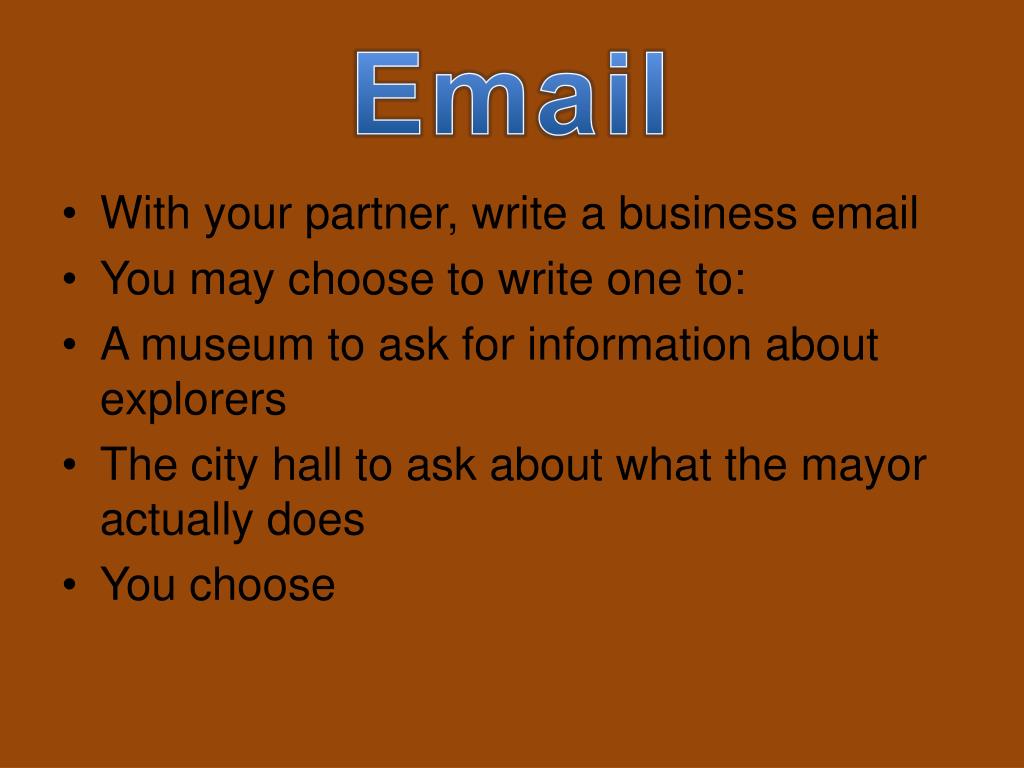 Email • With your partner, write a business email • You may choose to write one to: • A museum to ask for information about explorers • The city hall to ask about what the mayor actually does • You choose