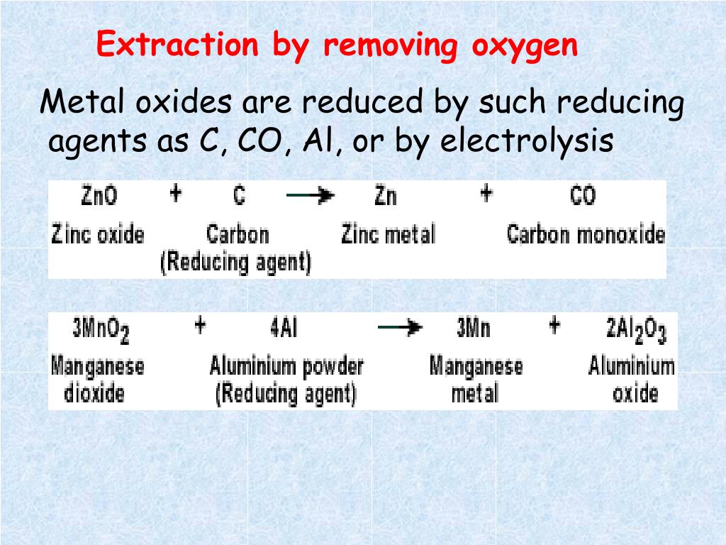 Extraction by removing oxygen Metal oxides are reduced by such reducing agents as C, CO, Al, or by electrolysis