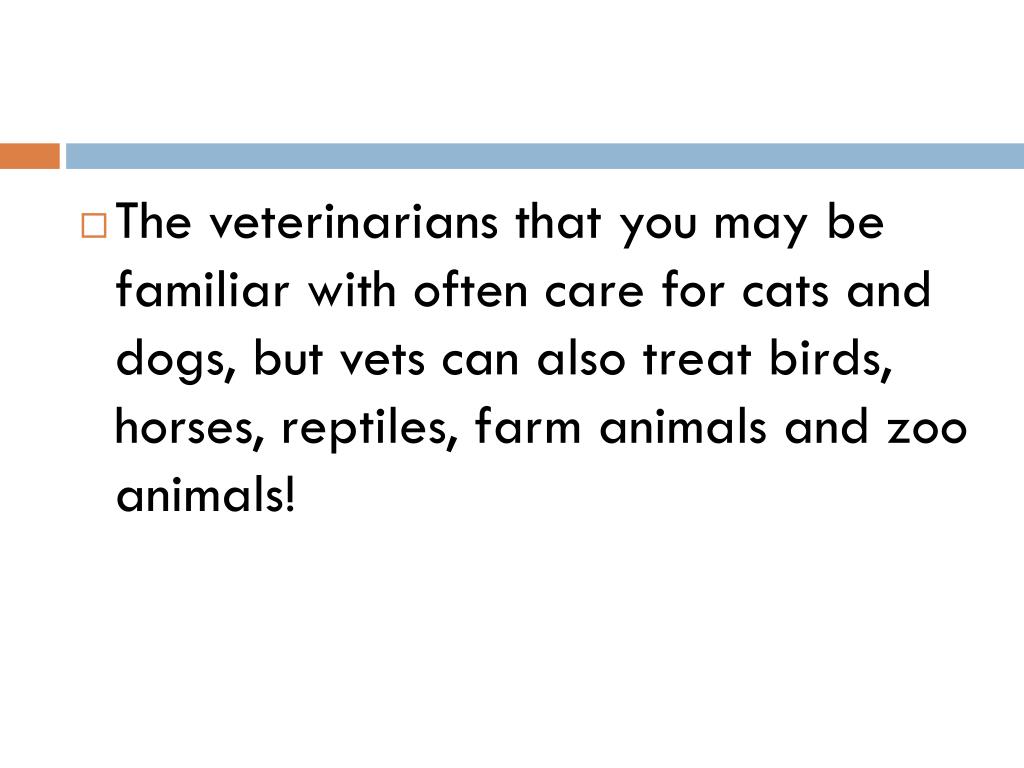 The veterinarians that you may be familiar with often care for cats and dogs, but vets can also treat birds, horses, reptiles, farm animals and zoo animals!