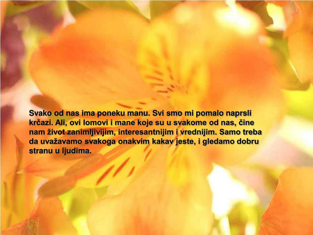 Svako od nas ima poneku manu. Svi smo mi pomalo naprsli krčazi. Ali, ovi lomovi i mane koje su u svakome od nas, čine nam život zanimljivijim, interesantnijim i vrednijim. Samo treba da uvažavamo svakoga onakvim kakav jeste, i gledamo dobru stranu u ljudima.