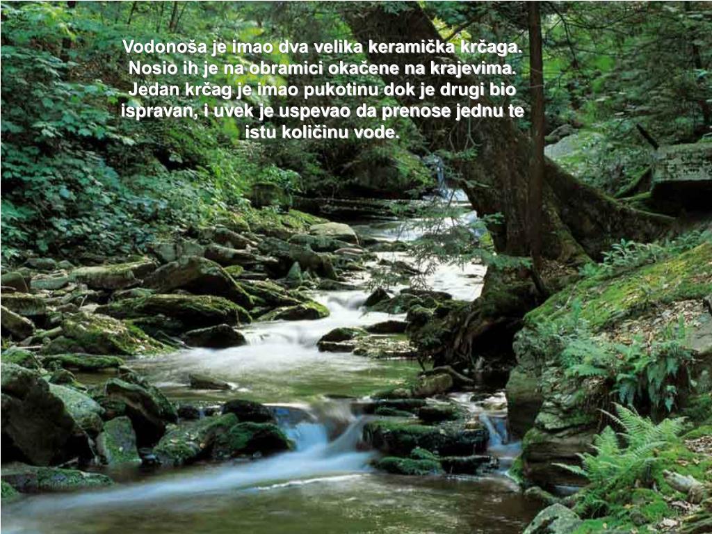 Vodono šina priča. Vodonoša je imao dva velika keramička krčaga. Nosio ih je na obramici okačene na krajevima. Jedan krčag je imao pukotinu dok je drugi bio ispravan, i uvek je uspevao da prenose jednu te istu količinu vode.