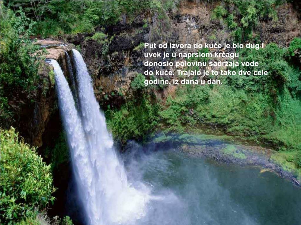 Put od izvora do kuće je bio dug i uvek je u naprslom krčagu donosio polovinu sadržaja vode do kuće. Trajalo je to tako dve cele godine, iz dana u dan.